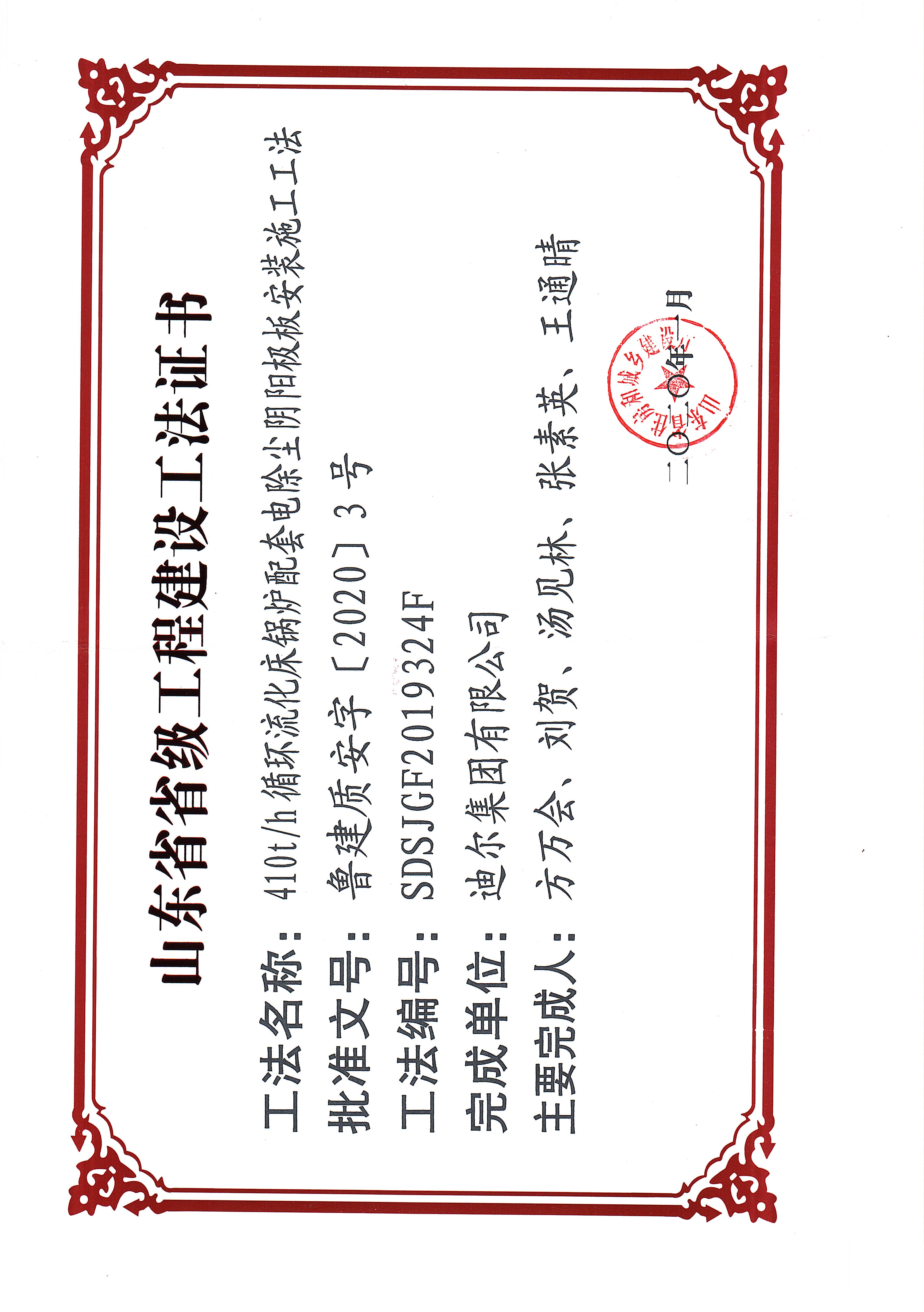 公司榮獲山東省省級(jí)“410th循環(huán)流化床鍋爐配套電除塵陰陽極板安裝施工工法”